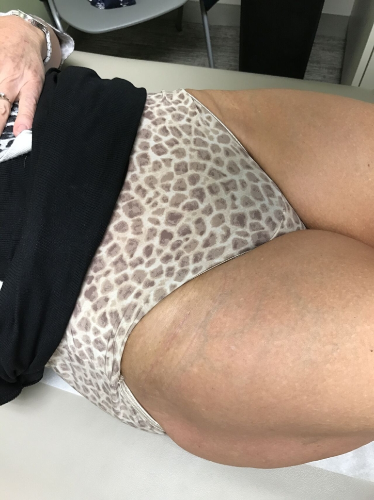 This patient had both hips operated on by Dr. Mast at different times. The left hip was replaced via a traditional incision, while the right hip had a bikini incision. She never fails to remind him which scar she prefers…..